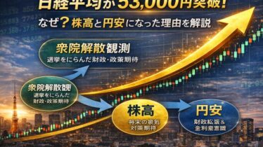 その他日常のモロモロ なぜ日経平均は5万3000円台まで急騰したのか? 衆院解散観測と円安158円の理由を初心者向けに解説 日経平均が史上初の5万3000円台へ急騰。衆議院解散観測で、なぜ株高と円安が同時に起きたのか?積極財政と為替の関係を初心者向けにやさしく解説します。 2026.01.13 その他日常のモロモロ